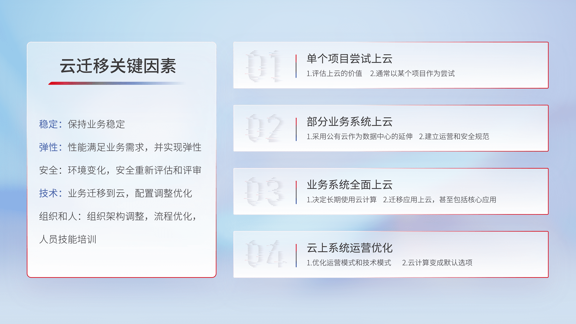 结合实际业务,,,,从规划设计、、、云平台选型、、云原生改造、、、、数据迁移、、集成交付,,,,迁移全过程为客户识别最佳上云路径,,做好风险识别管理,,,,设计网络架构、、、身份权限、、、、安全审计合规、、、、操作审计、、日志审计、、、、监控告警策略、、、多站点容灾设计等,,,,对云上基础设施进行整体规划,,提升IT治理水平,,,以满足弹性、、、、高可用、、、高性能的需求。。。