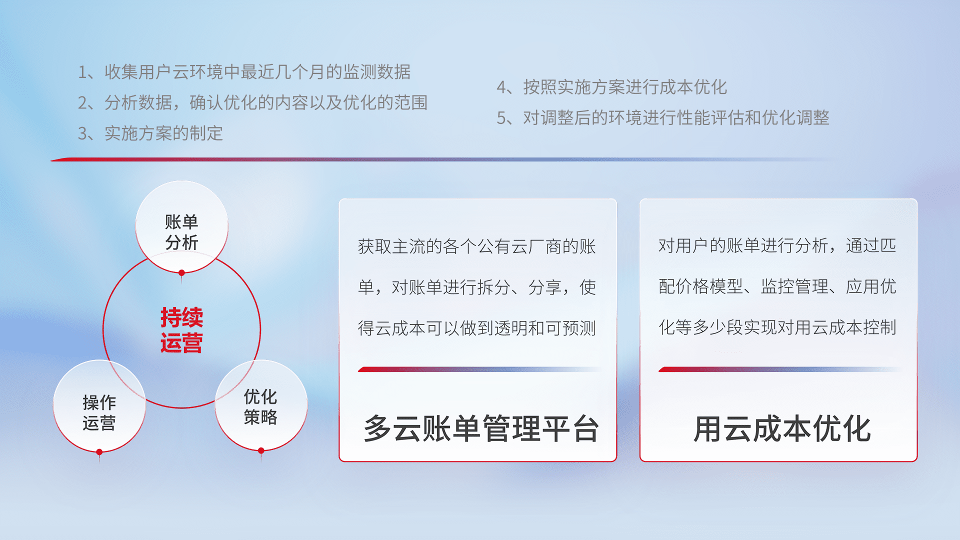 通过多云纳管,,以统一的资源数据模型把客户的云资源进行抽象和封装,,,,进而实现对多云资源的统一操作,,,保障云资源管理的可靠性、、、稳定性与可用性。。量身定制化运维内容,,,,配置、、、、开发运维、、、、补丁管理、、、、备份、、监控、、、认证和访问管理、、审计和日常巡检等,,保障在用云过程中的可靠度,,,稳定度以及高可用率。。。